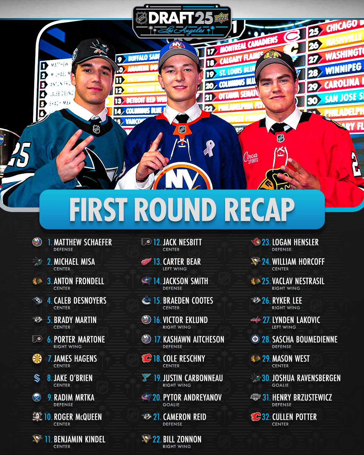 Вторым стал 32-й выбор драфта Каллен Поттер, чья мать, Дженни, является четырехкратной олимпийской медалисткой в составе сборной США по хоккею.