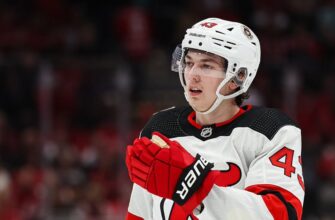 Защитник «Нью-Джерси Девилз» Люк Хьюз (43) с шайбой