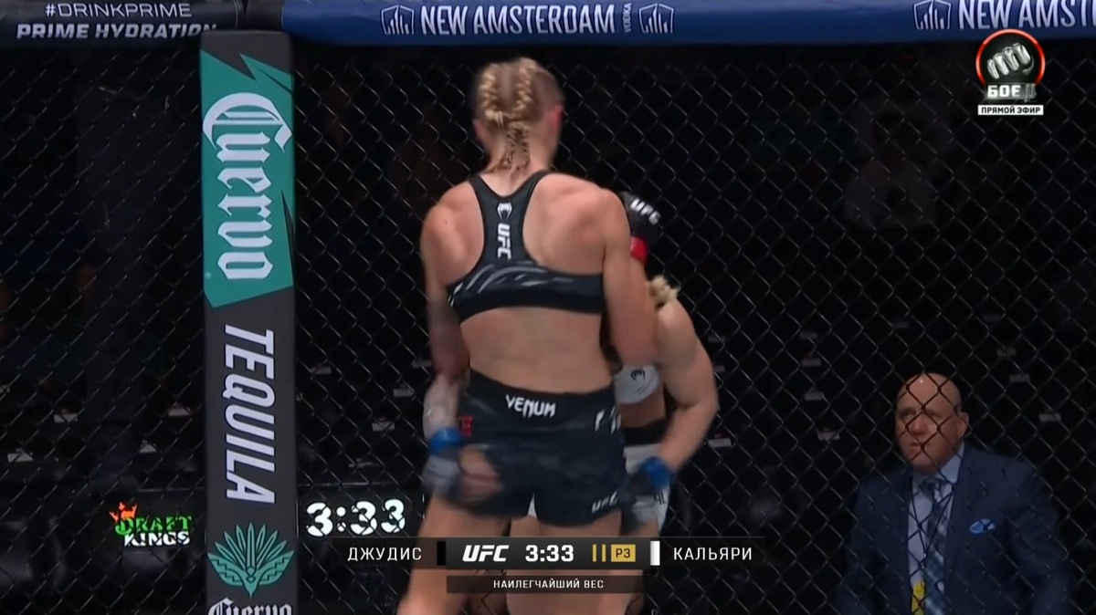 Как и ожидалось, Джудис воспользовалась своим преимуществом, прижала Калиари к сетке и завершила бой тем самым решающим ударом коленом.