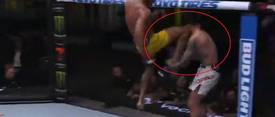 Команда комментаторов была на грани восторга, когда Оливейра после шага навстречу для обмена ударами внезапно нанес тот самый удар локтем с разворота. Удар не просто попал чисто, но и лишил Азизуна сознания еще до того, как его тело упало на канвас.