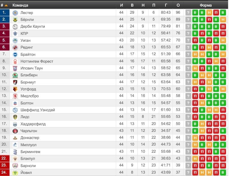 | 1 | Бирмингем | 39 | 28 | 8 | 3 | 43 | 92 |